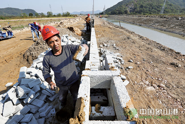 11月3日,工人们正在砌筑象山现代物流园区公共服务中心基建围墙,这条长1700余米的围墙将于近日完工,与此同时,建设用水、电、路等基建配套设施架设也已接近尾声。本月中旬,该中心停车场、配送中心等标段项目将陆续进场开工建设。